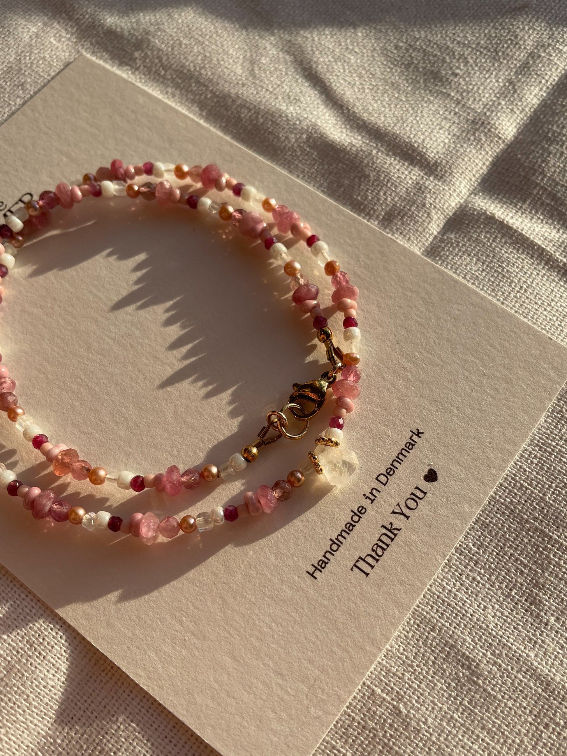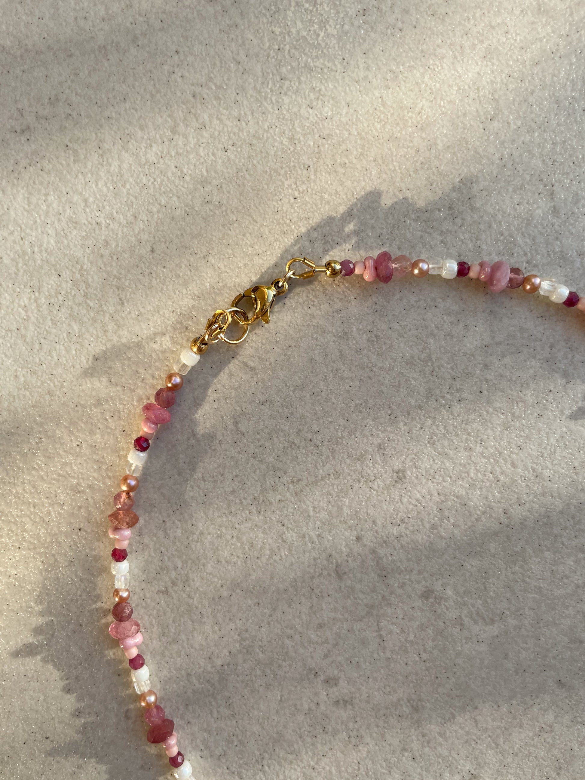 Where light shifts and intertwines — Amelia reflects the harmony of contrast and connection. Crafted with pink tourmaline, moonstone, soft peach pearls and Japanese glass beads, each bead carries a tone of its own, yet together they glow as one.